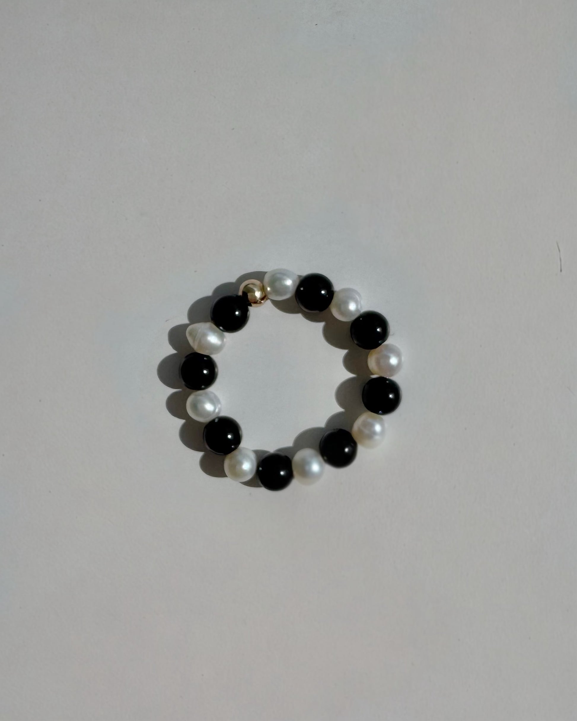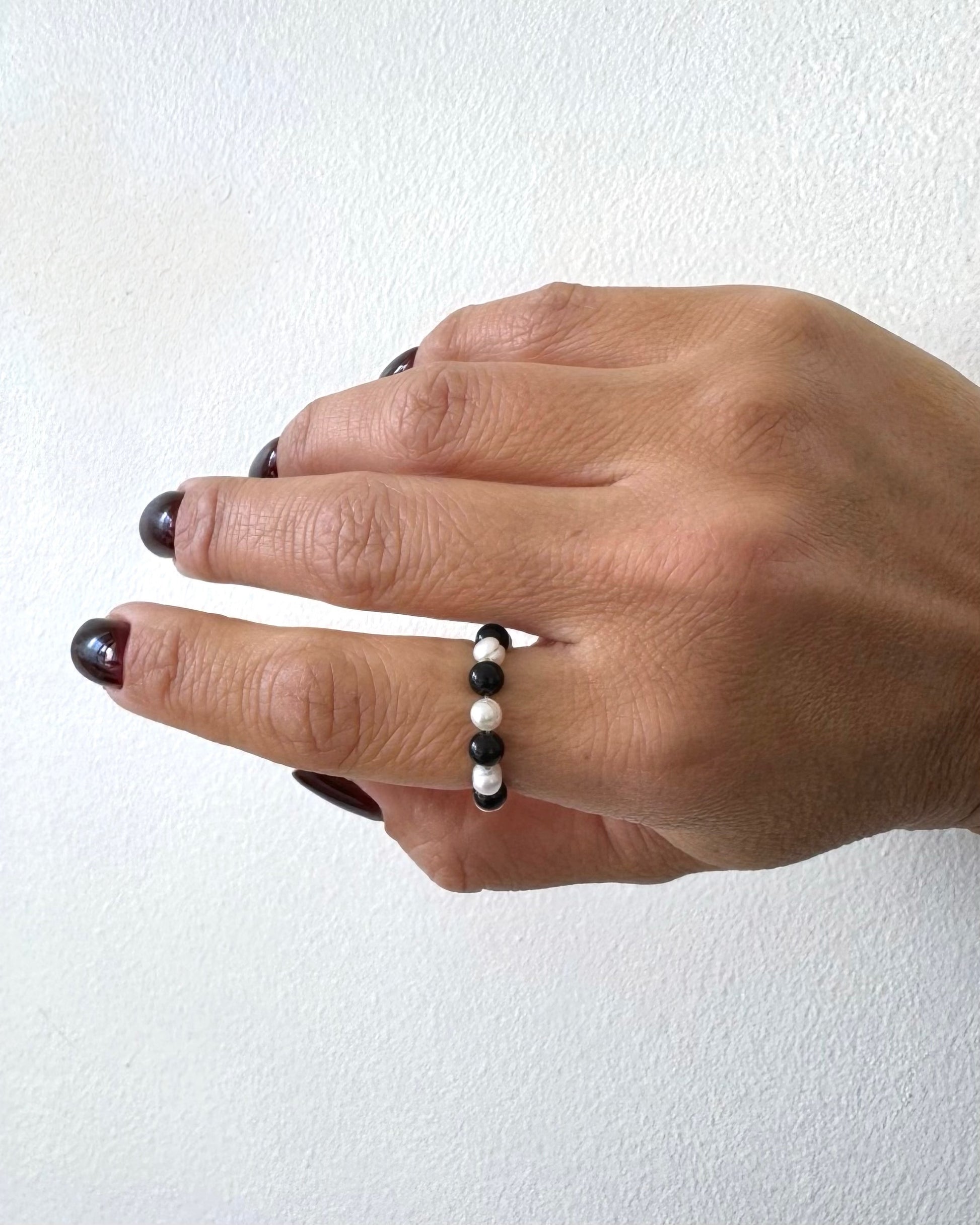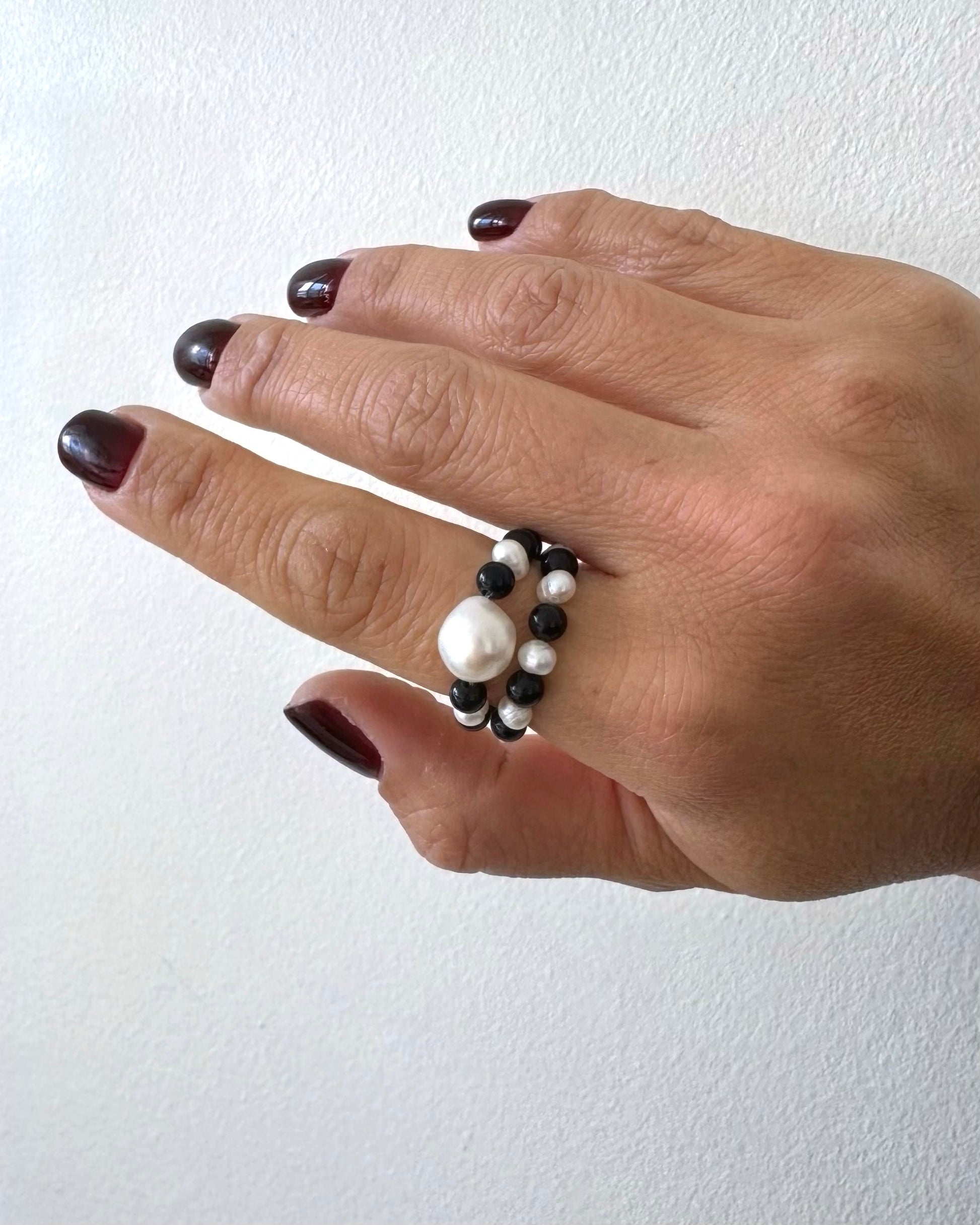 Each piece is uniquely handmade with semi-round pearls and little round and smooth black onyx — a little bold, a little dreamy, and full of charm.